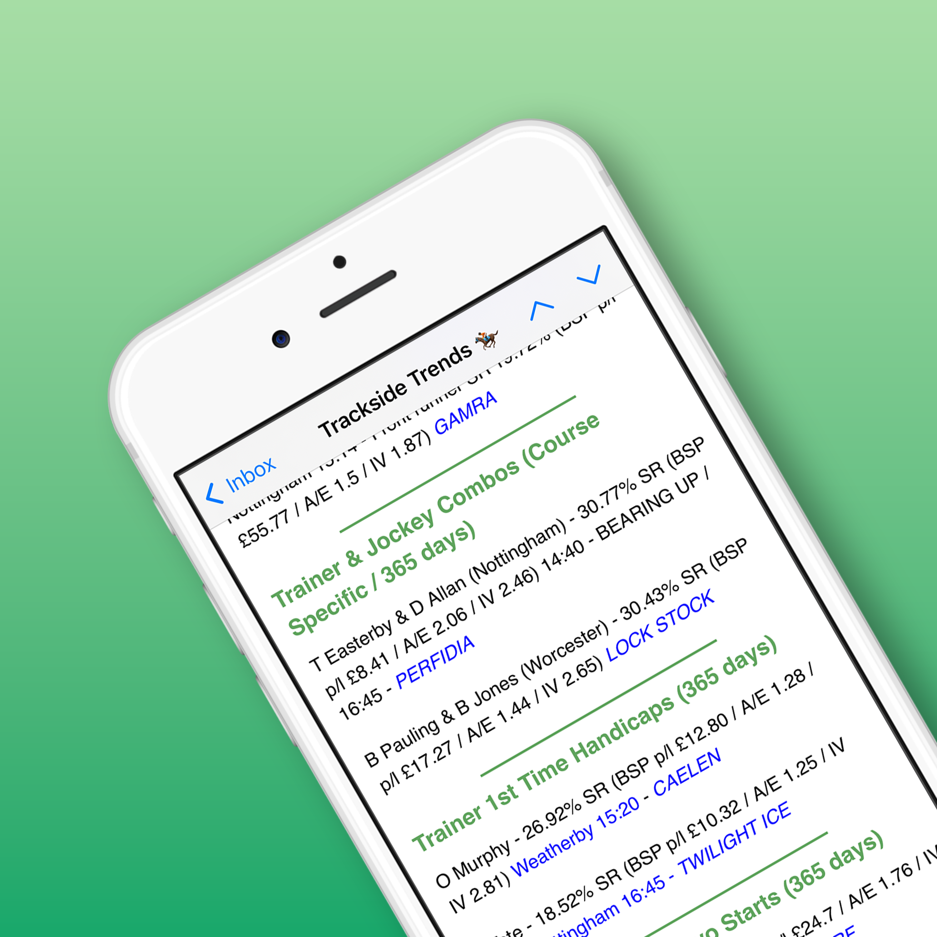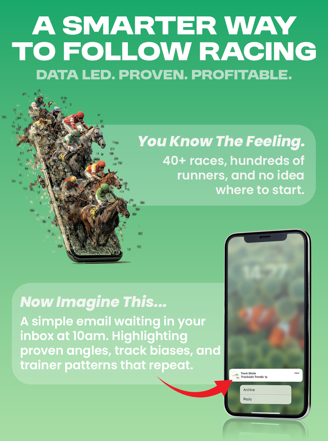 Trackside Trends is your daily email of hand-picked insights, tailored to the day’s course, distance, going, and field size.